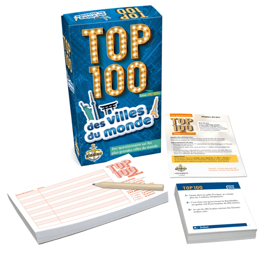 100 cartes (300 indices), 1 tablette de pointage, 1 crayon