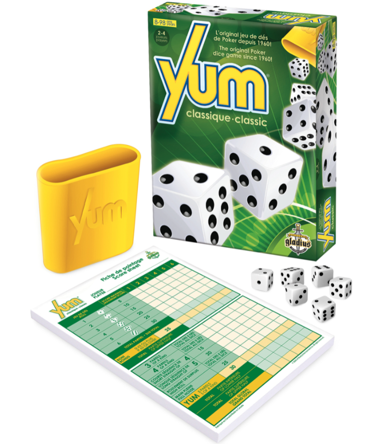 5 dés, 1 gobelet de plastique, 1 bloc pointage, 1 crayon